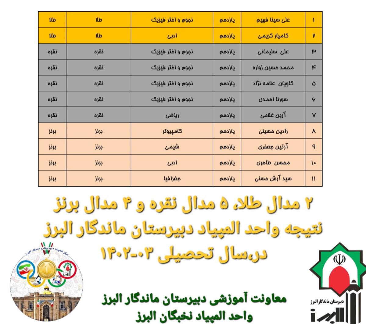 یازده مدال رنگارنگ طلا، نقره و برنز حاصل زحمات مدال آوران واحد المپیاد نخبگان البرز