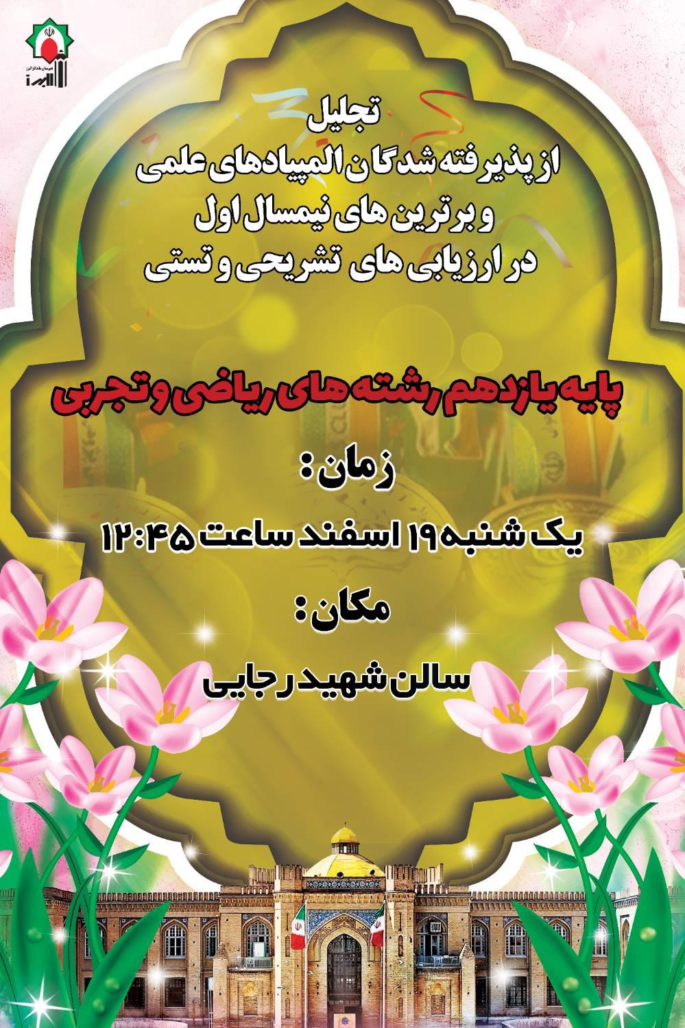 تجلیل از برترین های نیمسال اول در ارزیابی های تستی و تشریحی و پذیرفته شدگان مرحله اول المپیادهای علمی پایه یازدهم تجربی و ریاضی